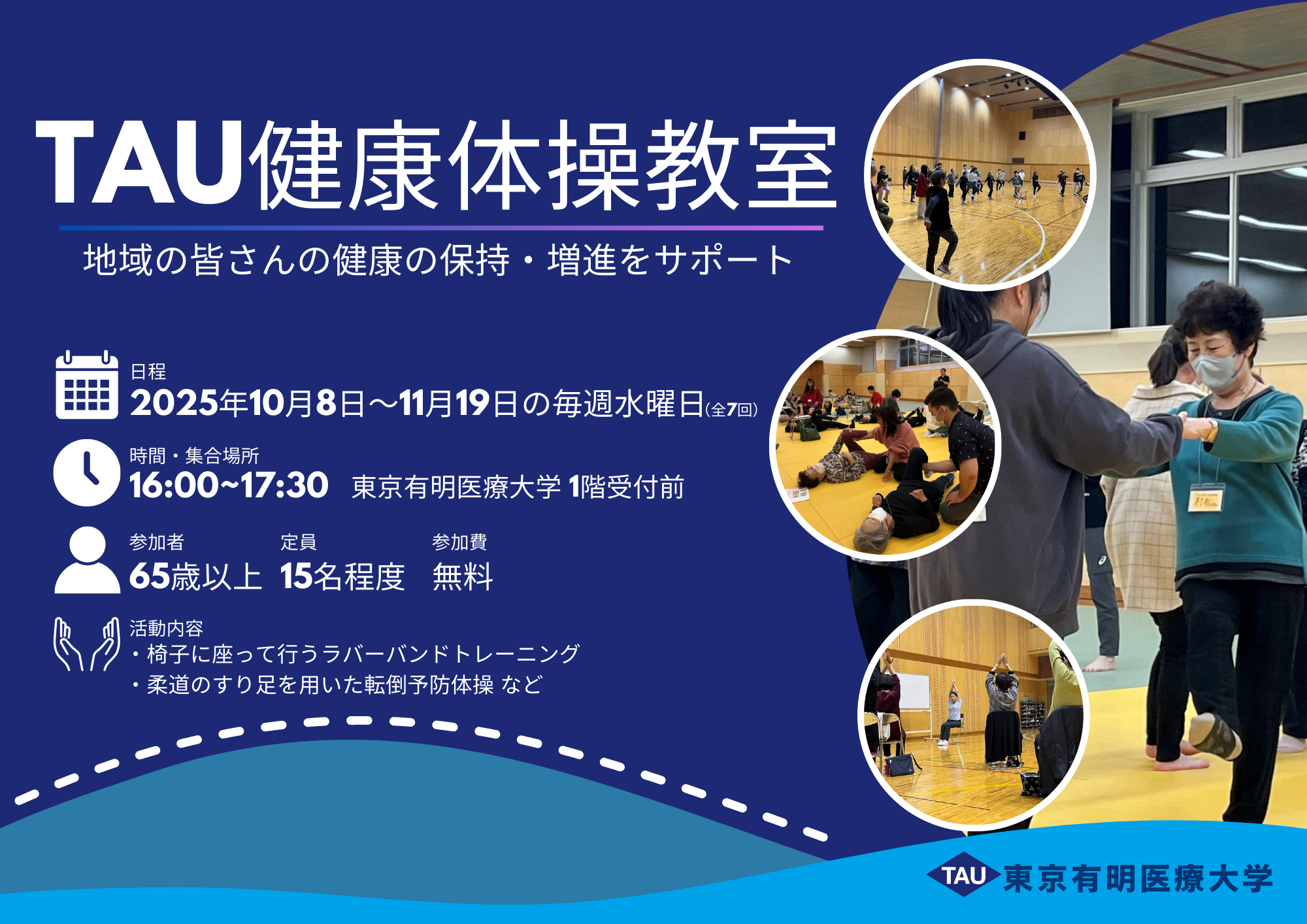 2025年10月8日(水)より東京有明医療大学において、地域の皆さんの健康の保持・増進を目的としてTAU健康体操教室を実施いたします。本教室は柔道整復学科の教員と学生ボランティアが一緒に皆さんの健康作りをサポートしていきます!!