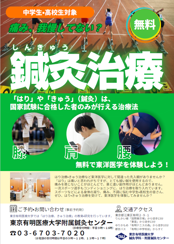 附属鍼灸センターにて中学生・高校生を対象とした「鍼灸治療体験(無料)」を実施しています。