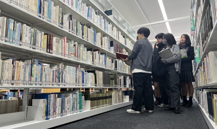 【図書館見学】医学書の多さに驚きの声があがっていました。図書館や自習室は眺めも良く、落ち着いて勉強できる環境が整っています。高校生の皆さんも利用することができます。
