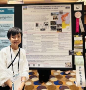 2024年元旦の能登半島地震で、帰省中に被災しました。東京に戻ってからも能登の人々が何を必要としているのか、遠方から研究者としてできることしたいと思いました。大学の特別研究費を獲得し、チームで現地調査を進め、これをきっかけに支援の輪、繋がりを作ることができました。調査では、精神疾患をお持ちの方はスタッフとの関係性を基盤に回復を進めていましたが、支援する側の専門職は、ご自身も被災しながら支援を続ける大変な状況であることがわかりました。学会では、審査員の先生方から研究の重要性についてコメントをいただきました。研究にご協力いただきました能登の皆様、研究チーム、大学の皆様に、心より感謝申し上げます。