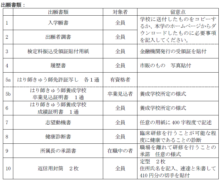 ・令和8年度 附属鍼灸センター研修生募集要項 ・令和8年度 附属鍼灸センター研修生入学願書 ・令和8年度 附属鍼灸センター研修生出願者調書 ・令和8年度 附属鍼灸センター研修生検定料振込金受取証 貼付用紙